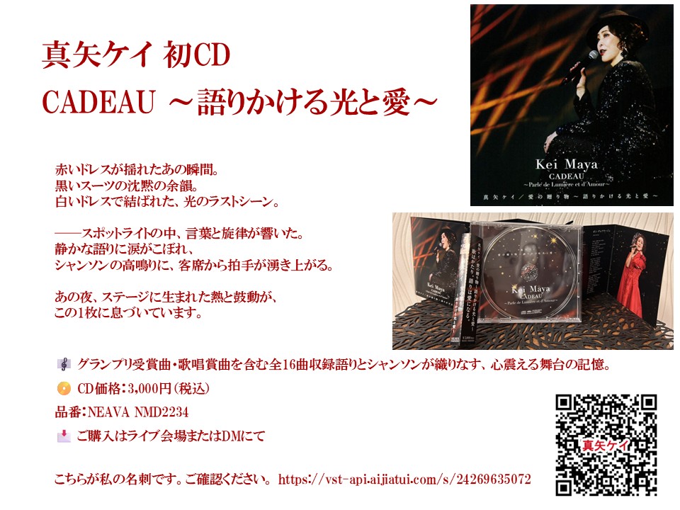 真矢ケイ CD 『CADEAU~語りかける光と愛~』リリース 2025.7 2025 10/15 お知らせ 2025年8月15日2025年10月15日 お知らせ よかったらシェアしてね! URLをコピーしました! URLをコピーしました! 第63回 パリ祭 出演 11月18日(火) 真矢ケイプロデュ―ス ことばと歌で生きる~マディソン郡の恋 この記事を書いた人 真矢ケイ 応援クラブ 関連記事関連する記事はまだ見つかりませんでした。 コメント コメントする コメントをキャンセルコメント ※ 名前 ※ メール ※ サイト 次回のコメントで使用するためブラウザーに自分の名前、メールアドレス、サイトを保存する。 上に表示された文字を入力してください。